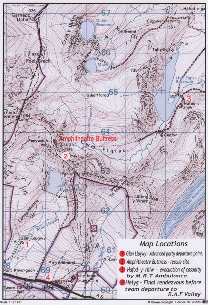 1630 Tannoy for MRT.Since Colonel Finch had suggested that some of the party might have been able to commence evacuation, and that they then would use the southwest approach, via Ffynnon Llugwy, Lees was able to point out the road-head and Ambulance point to Flight Lieutenant Jones, who had come to offer assistance, although he could not leave camp due to night flying. The base was to be Glan Llugwy farm but a strong possibility that if the man was still on the crag when we arrived, the evacuation route used would be Cwm Eigiau, Hafod-y-rhiw. Fortunately the Medical Officer (MO) is a local man. All MR. transport thus diverted to Glan Llugwy to start with (See no.1 on map).