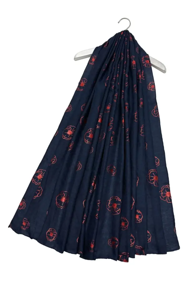 Lightweight navy blue poppy scarf with red foil poppy design.