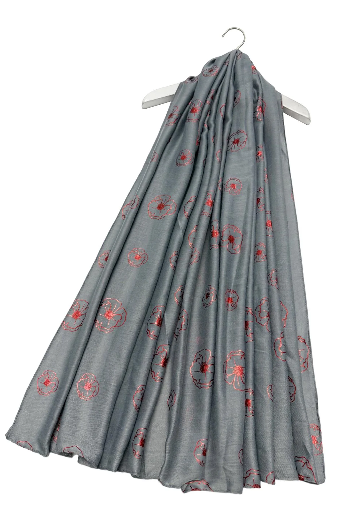 Lightweight grey scarf with red foil poppy design.